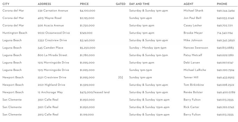 Corona del Mar 239 Carnation Avenue $4,100,000 Saturday & Sunday 1pm-4pm Michael Shank 949.244.3494 Corona del Mar 4615 Wayne Road $2,195,000 Sunday 1pm-4pm Jon Paul Bell 949.933.2246 Corona del Mar 506 Acacia Avenue $1,750,000 Saturday 1pm-4pm Casey Lesher 949.702.7211 Huntington Beach 9022 Oceanwood Drive $749,000 Saturday 1pm-4pm Brooke Meyer 714.342.1194 Laguna Beach 2352 Crestview Drive $3,140,000 Saturday & Sunday 1pm-4pm Mike Johnson 949.342.3650 Laguna Beach 345 Camden Place $5,250,000 Sunday – Monday 2pm-5pm Nancee Swensson 949.813.6883 Laguna Beach 800 La Mirada Street $1,780,000 Saturday & Sunday 1pm-5pm Patsy Metcalf 949.629.1280 Laguna Beach 1515 Morningside Drive $1,695,000 Saturday 1pm-4pm Debi Larsen 949.697.9747 Laguna Beach 1515 Morningside Drive $1,695,000 Sunday 1pm-5pm Michael LaRiche 949.290.7594 Newport Beach 2521 Crestview Drive $1,695,000 [G] Sunday 1pm-4pm Tanner Hill 949.433.9563 Newport Beach 2021 Highland Drive $1,599,000 Saturday & Sunday 1pm-4pm Tom Birkinbine 949.698.2522 Newport Beach 12 Anchorage Way $475,000/leased land Saturday & Sunday 1pm-4pm Renée Bolster 949.400.0789 San Clemente 3921 Calle Real $1,950,000 Saturday & Sunday 12pm-4pm Barry Fulton 949.613.2555 San Clemente 3921 Calle Real $1,950,000 Saturday & Sunday 12pm-4pm Rick Carter 949.292.0742 San Clemente 3913 Calle Real $1,199,000 Saturday & Sunday 12pm-4pm Barry Fulton 949.613.2555