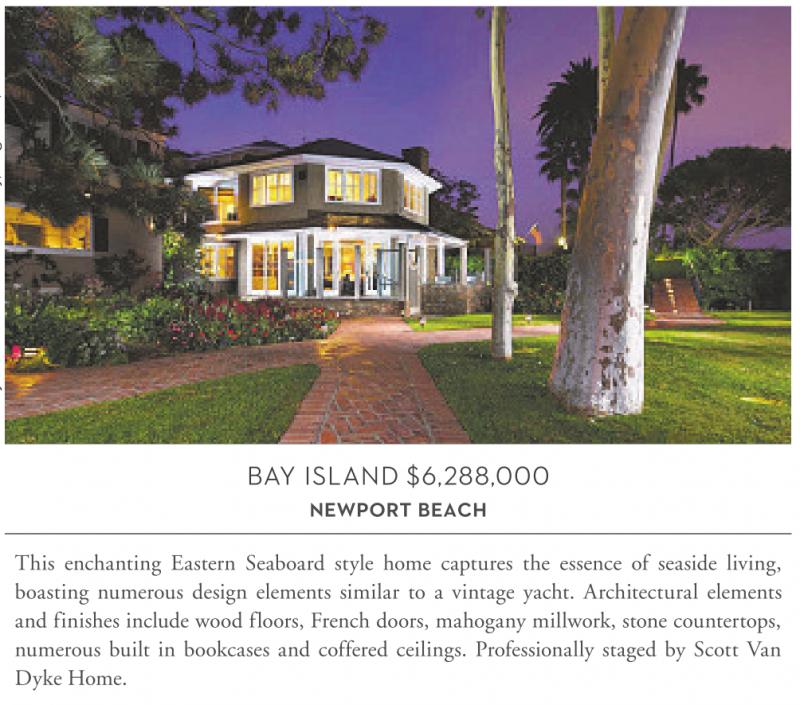 16 BAY ISLAND $6,288,000 NEWPORT BEACH This enchanting Eastern Seaboard style home captures the essence of seaside living, boasting numerous design elements similar to a vintage yacht. Architectural elements and finishes include wood floors, French doors, mahogany millwork, stone countertops, numerous built in bookcases and coffered ceilings. Professionally staged by Scott Van Dyke Home.