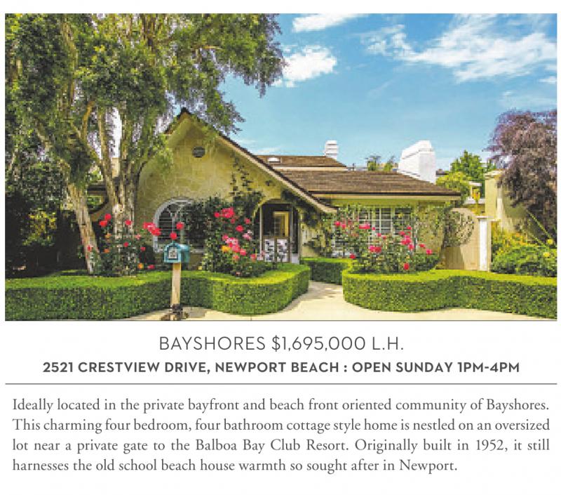 BAYSHORES $1,695,000 L.H. 2521 CRESTVIEW DRIVE, NEWPORT BEACH : OPEN SUNDAY 1PM-4PM Ideally located in the private bayfront and beach front oriented community of Bayshores. This charmingfourbedroom,fourbathroomcottage style home is nestledonanoversized lot near a private gate to the Balboa Bay Club Resort. Originally built in 1952, it still harnesses the old school beach house warmth so sought after in Newport. bibb