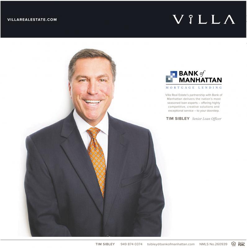 VILLAREALESTATE.COM Villa Real Estate’s partnership with Bank of Manhattan delivers the nation’s most seasoned loan experts – offering highly competitive, creative solutions and exceptional service – to your doorstep. TIM SIBLEY Senior Loan Officer TIM SIBLEY 949 874 0374 tsibley@bankofmanhattan.com NMLS No.260939