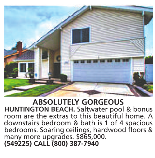 ABSOLUTELY GORGEOUS HUNTINGTON BEACH. Saltwater pool & bonus room are the extras to this beautiful home. A downstairs bedroom & bath is 1 of 4 spacious bedrooms. Soaring ceilings, hardwood floors & many more upgrades. $865,000. (549225) CALL (800) 387-7940