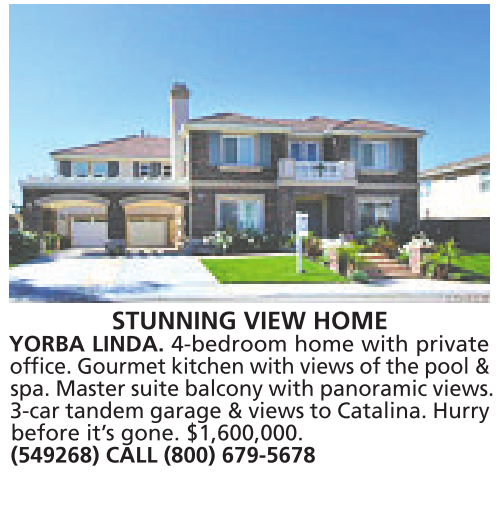 STUNNING VIEW HOME YORBA LINDA. 4-bedroom home with private office. Gourmet kitchen with views of the pool & spa. Master suite balcony with panoramic views. 3-cartandem garage &views to Catalina. Hurry before it’s gone. $1,600,000. (549268) CALL (800) 679-5678
