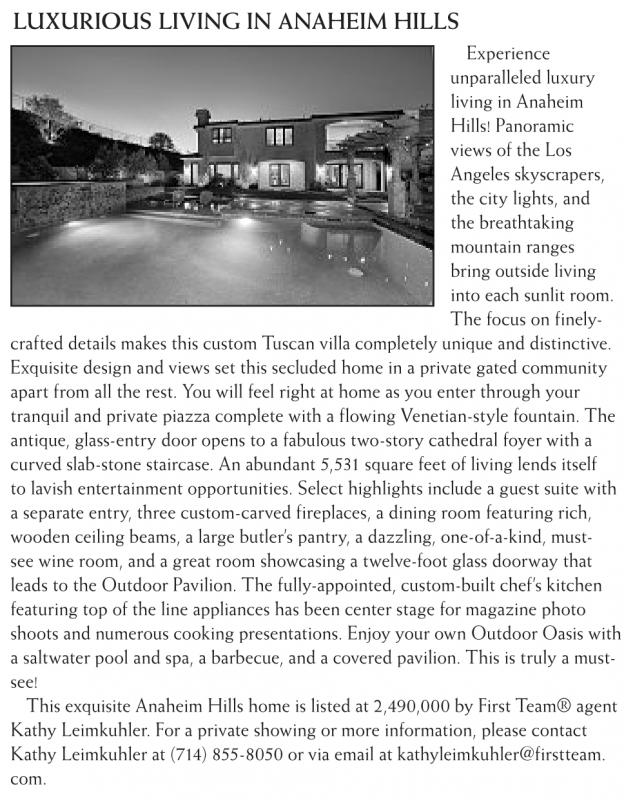 LUXURIOUS LIVING IN ANAHEIM HILLS Experience unparalleled luxury living in Anaheim Hills! Panoramic views of the Los Angeles skyscrapers, the city lights, and the breathtaking mountain ranges bring outside living into each sunlit room. The focus on finelycrafted details makes this custom Tuscan villa completely unique and distinctive. Exquisite design and views set this secluded home in a private gated community apart from all the rest. You will feel right at home as you enter through your tranquil and private piazza complete with a flowing Venetian-style fountain. The antique, glass-entry door opens to a fabulous two-story cathedral foyer with a curved slab-stone staircase. An abundant 5,531 square feet of living lends itself to lavish entertainment opportunities. Select highlights include a guest suite with a separate entry, three custom-carved fireplaces, a dining room featuring rich, wooden ceiling beams, a large butler’s pantry, a dazzling, one-of-a-kind, mustsee wine room, and a great room showcasing a twelve-foot glass doorway that leads to the Outdoor Pavilion. The fully-appointed, custom-built chef’s kitchen featuring top of the line appliances has been center stage for magazine photo shoots and numerous cooking presentations. Enjoy your own Outdoor Oasis with a saltwater pool and spa, a barbecue, and a covered pavilion. This is truly a mustsee! This exquisite Anaheim Hills home is listed at 2,490,000 by First Team® agent Kathy Leimkuhler. For a private showing or more information, please contact Kathy Leimkuhler at (714) 855-8050 or via email at kathyleimkuhler@firstteam. com.