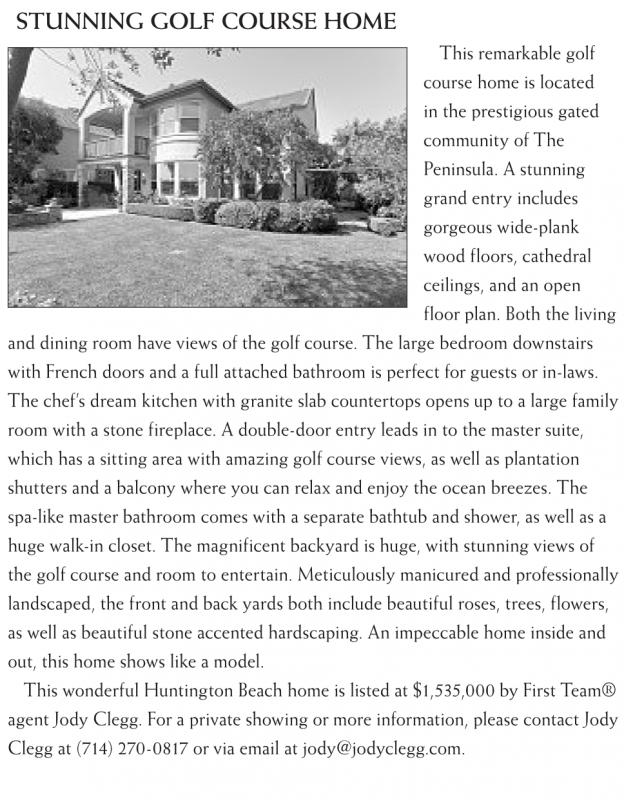 STUNNING GOLF COURSE HOME This remarkable golf course home is located in the prestigious gated community of The Peninsula. A stunning grand entry includes gorgeous wide-plank wood floors, cathedral ceilings, and an open floor plan. Both the living and dining room have views of the golf course. The large bedroom downstairs with French doors and a full attached bathroom is perfect for guests or in-laws. The chef’s dream kitchen with granite slab countertops opens up to a large family room with a stone fireplace. A double-door entry leads in to the master suite, which has a sitting area with amazing golf course views, as well as plantation shutters and a balcony where you can relax and enjoy the ocean breezes. The spa-like master bathroom comes with a separate bathtub and shower, as well as a huge walk-in closet. The magnificent backyard is huge, with stunning views of the golf course and room to entertain. Meticulously manicured and professionally landscaped, the front and back yards both include beautiful roses, trees, flowers, as well as beautiful stone accented hardscaping. An impeccable home inside and out, this home shows like a model. This wonderful Huntington Beach home is listed at $1,535,000 by First Team® agent Jody Clegg. For a private showing or more information, please contact Jody Clegg at (714) 270-0817 or via email at jody@jodyclegg.com.