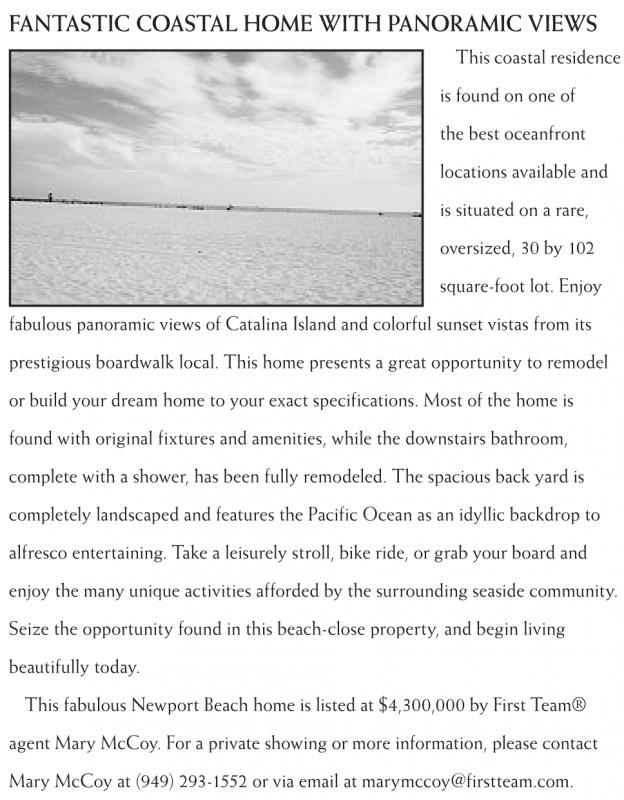 FANTASTIC COASTAL HOME WITH PANORAMIC VIEWS This coastal residence is found on one of the best oceanfront locations available and is situated on a rare, oversized, 30 by 102 square-foot lot. Enjoy fabulous panoramic views of Catalina Island and colorful sunset vistas from its prestigious boardwalk local. This home presents a great opportunity to remodel or build your dream home to your exact specifications. Most of the home is found with original fixtures and amenities, while the downstairs bathroom, complete with a shower, has been fully remodeled. The spacious back yard is completely landscaped and features the Pacific Ocean as an idyllic backdrop to alfresco entertaining. Take a leisurely stroll, bike ride, or grab your board and enjoy the many unique activities afforded by the surrounding seaside community. Seize the opportunity found in this beach-close property, and begin living beautifully today. This fabulous Newport Beach home is listed at $4,300,000 by First Team® agent Mary McCoy. For a private showing or more information, please contact Mary McCoy at (949) 293-1552 or via email at marymccoy@firstteam.com.