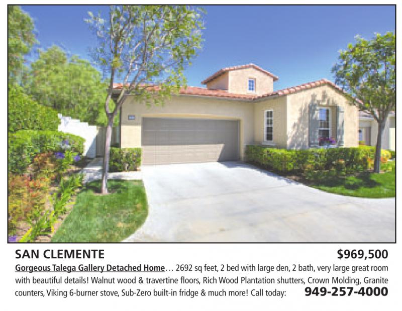 SAN CLEMENTE $969,500 Gorgeous Talega Gallery Detached Home…2692 sq feet, 2bed with large den, 2bath, very large great room with beautiful details! Walnut wood &travertine floors,Rich Wood Plantation shutters,Crown Molding, Granite counters,Viking 6-burner stove,Sub-Zero built-in fridge &much more! Call today: 949-257-4000