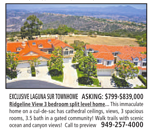 EXCLUSIVE LAGUNA SUR TOWNHOME ASKING: $799-$839,000 Ridgeline View 3bedroom splitlevel home... This immaculate home onacul-de-sac has cathedral ceilings, views, 3spacious rooms, 3.5 bath inagated community! Walk trails with scenic ocean andcanyonviews! Calltopreview 949-257-4000