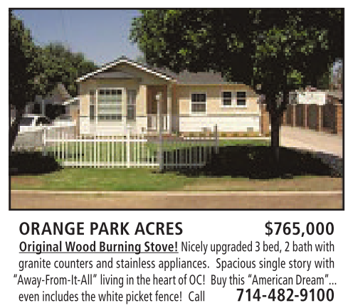 ORANGE PARK ACRES $765,000 Original Wood BurningStove! Nicelyupgraded 3bed,2bathwith granite counters and stainless appliances. Spacious single story with “Away-From-It-All” living in theheartofOC! Buythis “AmericanDream”... even includes thewhite picket fence! Call 714-482-9100