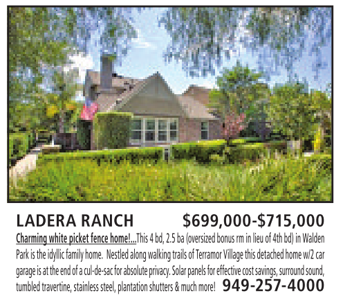 LADERA RANCH $699,000-$715,000 Charming white picket fence home!...This 4bd, 2.5ba(oversizedbonus rm in lieu of 4thbd) in Walden Park is theidyllicfamilyhome. Nestledalong walking trails of TerramorVillage this detachedhome w/2car garageisatthe end of acul-de-sacfor absolute privacy.Solar panels for effectivecost savings,surroundsound, tumbledtravertine, stainlesssteel, plantation shutters&much more! 949-257-4000