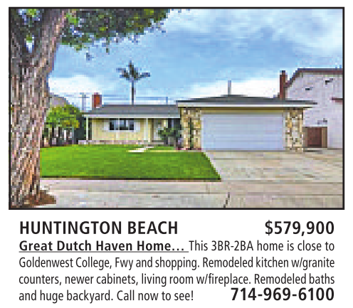 HUNTINGTON BEACH $579,900 Great Dutch Haven Home… This 3BR-2BA home is close to Goldenwest College,Fwy andshopping. Remodeledkitchen w/granite counters, newer cabinets, living room w/fireplace.Remodeledbaths andhugebackyard. Call nowtosee! 714-969-6100