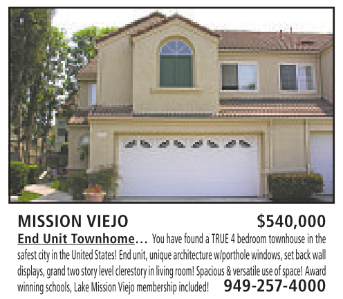 MISSION VIEJO $540,000 End Unit Townhome… You have found aTRUE 4bedroom townhouse in the safest cityinthe UnitedStates! Endunit, unique architecture w/porthole windows, set back wall displays, grandtwo storylevel clerestoryinliving room!Spacious &versatile useofspace!Award winningschools,LakeMission Viejo membershipincluded! 949-257-4000