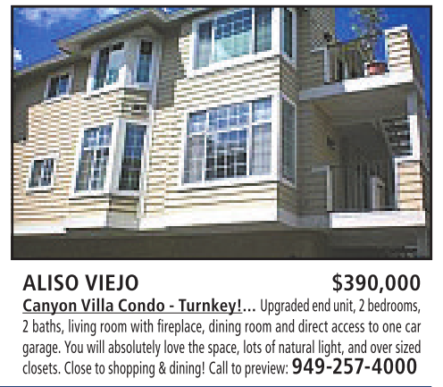 ALISO VIEJO $390,000 Canyon VillaCondo-Turnkey!... Upgraded end unit,2bedrooms, 2baths, living room with fireplace, dining room and direct access to one car garage. You will absolutely love the space, lots ofnatural light, and over sized closets. Close to shopping&dining! Call to preview: 949-257-4000
