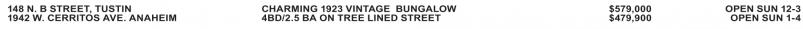 148 N. B STREET, TUSTIN CHARMING 1923 VINTAGE BUNGALOW $579,000 OPEN SUN 12-3 1942 W. CERRITOS AVE. ANAHEIM 4BD/2.5 BA ON TREE LINED STREET $479,900 OPEN SUN 1-4
