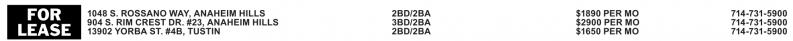 1048 S. ROSSANO WAY, ANAHEIM HILLS 2BD/2BA $1890 PER MO 714-731-5900 904 S. RIM CREST DR. #23, ANAHEIM HILLS 3BD/2BA $2900 PER MO 714-731-5900 13902 YORBA ST. #4B, TUSTIN 2BD/2BA $1650 PER MO 714-731-5900