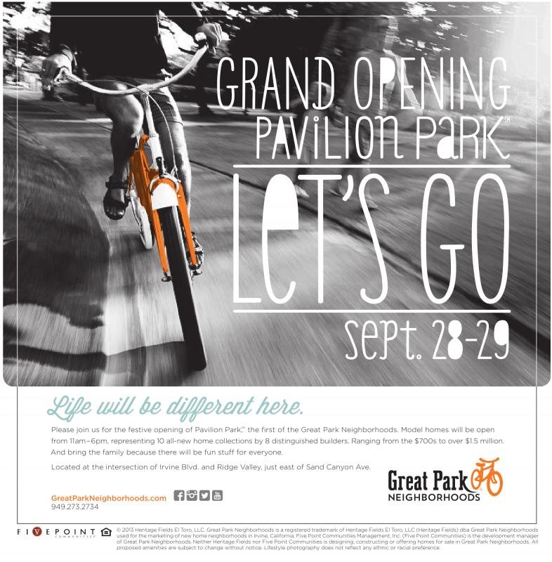 Life will be different here. Please join us for the festive opening of Pavilion Park M the first of the Great Park Neighborhoods. Model homes will be open from 11am–6pm, representing 10 all-new home collections by 8 distinguished builders. Ranging from the $700s to over $1.5 million. And bring the family because there will be fun stuff for everyone. Located at the intersection of Irvine Blvd. and Ridge Valley, just east of Sand Canyon Ave. GreatParkNeighborhoods.com 949.273.2734 ©2013 Heritage Fields El Toro, LLC. Great Park Neighborhoods is aregistered trademark of Heritage Fields El Toro, LLC (Heritage Fields) dba Great Park Neighborhoods used forthe marketing of newhome neighborhoods in Irvine,California. FivePoint Communities Management, Inc. (FivePoint Communities)isthe development manager of Great Park Neighborhoods. Neither Heritage Fields nor Five Point Communities is designing, constructing or offering homes for sale in Great Park Neighborhoods. All proposed amenities are subject to change without notice. Lifestyle photography does not reflect any ethnic or racial preference.