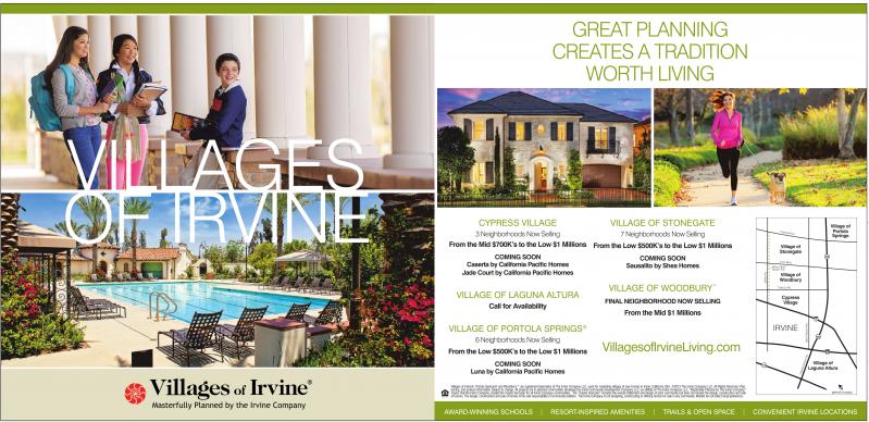 Villages of Irvine®, Portola Springs® and Woodbury™ are registered trademarks of The Irvine Company LLC, used for marketing villages of new homes in Irvine, California USA.©2013 The Irvine Company LLC. All Rights Reserved. Plan, pricing, and product information subject to change. All projects are in planned communities developed by Irvine Community Development Company LLC, an affiliate of The Irvine Company LLC. “Masterfully Planned by The Irvine Company” means that the Irvine Company created the master land plan for all Irvine Company communities. The “master land plan” includes the overall entitlement and design of each community but does not include the design, construction and sale of homes. The design, construction and sale of homes is the sole responsibility of community builders. The Irvine Company is not designing, constructing or offering homes for sale in any community.Models do not reflect racial preference.