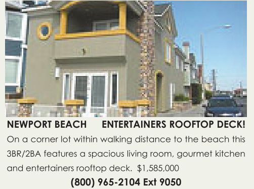 NEWPORT BEACH ENTERTAINERS ROOFTOP DECK! On acorner lot within walking distance to the beach this 3BR/2BA features aspacious living room, gourmet kitchen and entertainers rooftop deck. $1,585,000 (800) 965-2104 Ext 9050