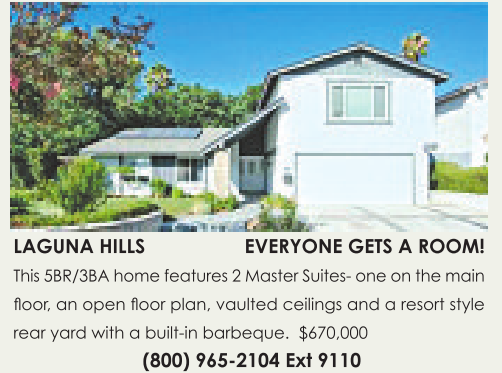 This 5BR/3BAhome features 2Master Suites- one on the main floor, anopen floor plan, vaulted ceilings and aresort style rear yard with abuilt-in barbeque. $670,000 (800) 965-2104 Ext 9110