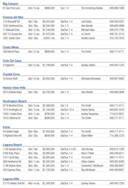 Corona del Mar 119 Shorecliff Rd 4bd /3ba $5,525,000 Sat/Sun 1-4 Judi Garby 949.500.0351 1032 Goldenrod Ave 3bd /3ba $2,595,000 Sun 1-5 Alan Bynder 949.689.3698 17 Mainsail Drive 3bd /2+ba $1,239,000 Sat/Sun 1-4 Michael Salas 949.370.7792 432 1/2 Acacia Ave 2bd /2+ba $1,075,000 Sat/Sun 1-4 Liz Grech 949.701.3112 1601 Castle Cove 4bd /3ba 6,800 /mo Sun 1-4 Genille Lauren 310.720.7810