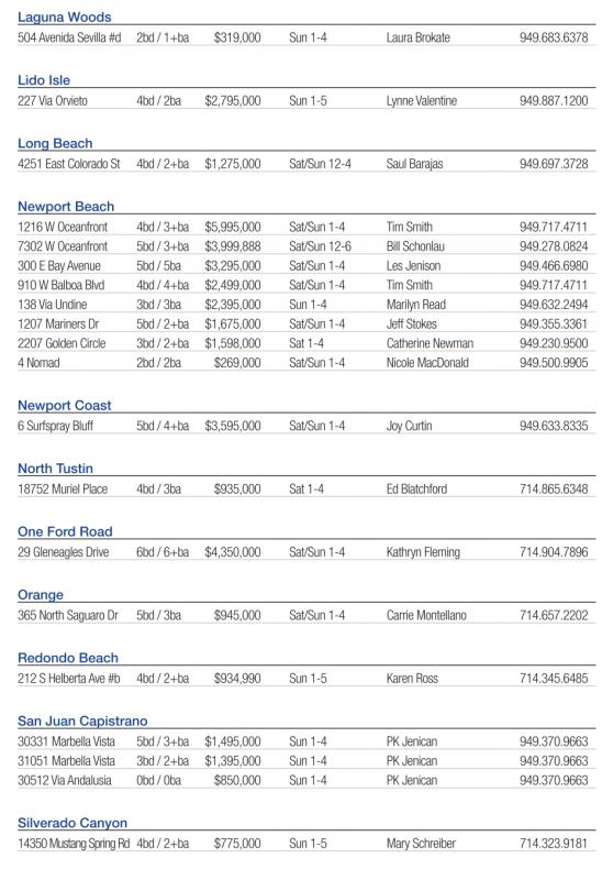 Newport Beach 1216 WOceanfront 4bd /3+ba $5,995,000 Sat/Sun 1-4 TimSmith 949.717.4711 7302 WOceanfront 5bd /3+ba $3,999,888 Sat/Sun 12-6 Bill Schonlau 949.278.0824 300 EBay Avenue 5bd /5ba $3,295,000 Sat/Sun 1-4 Les Jenison 949.466.6980 910 WBalboa Blvd 4bd /4+ba $2,499,000 Sat/Sun 1-4 TimSmith 949.717.4711 138 Via Undine 3bd /3ba $2,395,000 Sun 1-4 Marilyn Read 949.632.2494 1207 Mariners Dr 5bd /2+ba $1,675,000 Sat/Sun 1-4 Jeff Stokes 949.355.3361 2207 Golden Circle 3bd /2+ba $1,598,000 Sat 1-4 Catherine Newman 949.230.9500 4Nomad 2bd /2ba $269,000 Sat/Sun 1-4 Nicole MacDonald 949.500.9905