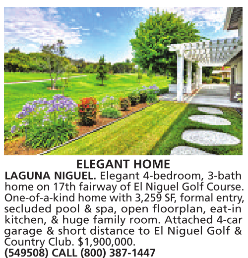 ELEGANT HOME LAGUNA NIGUEL. Elegant 4-bedroom, 3-bath home on 17th fairway of El Niguel Golf Course. One-of-a-kind home with 3,259 SF,formal entry, secluded pool & spa, open floorplan, eat-in kitchen, & huge family room. Attached 4-car garage & short distance to El Niguel Golf & Country Club. $1,900,000. (549508) CALL (800) 387-1447