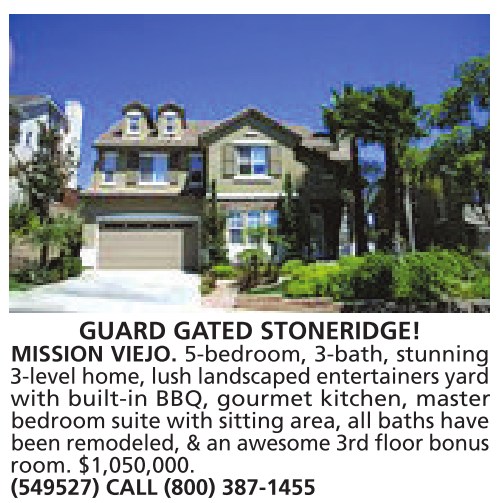 GUARD GATED STONERIDGE! MISSION VIEJO. 5-bedroom, 3-bath, stunning 3-level home, lush landscaped entertainers yard with built-in BBQ, gourmet kitchen, master bedroom suite with sitting area, all baths have been remodeled, &anawesome 3rd floor bonus room. $1,050,000. (549527) CALL (800) 387-1455