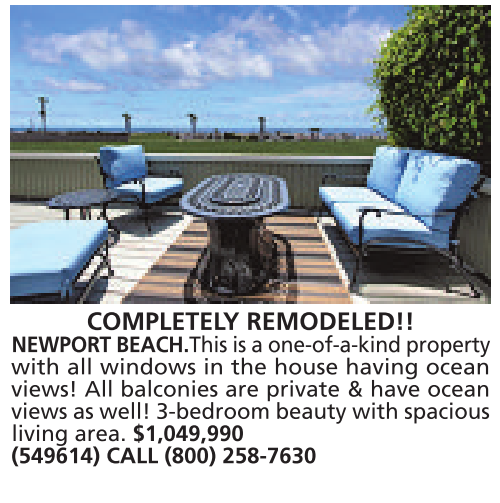 COMPLETELY REMODELED!! NEWPORTBEACH.This is aone-of-a-kind property with all windows in the house having ocean views! All balconies are private & have ocean views as well! 3-bedroom beauty with spacious living area. $1,049,990 (549614) CALL (800) 258-7630