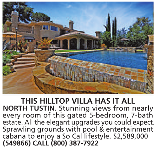 THIS HILLTOP VILLA HAS IT ALL NORTH TUSTIN. Stunning views from nearly every room of this gated 5-bedroom, 7-bath estate. All the elegant upgrades you could expect. Sprawling grounds with pool & entertainment cabana to enjoy a So Cal lifestyle. $2,589,000 (549866) CALL (800) 387-7922