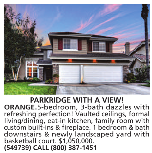 ORANGE.5-bedroom, 3-bath dazzles with refreshing perfection! Vaulted ceilings, formal living/dining, eat-in kitchen, family room with custom built-ins &fireplace. 1bedroom &bath downstairs & newly landscaped yard with basketball court. $1,050,000. (549739) CALL (800) 387-1451