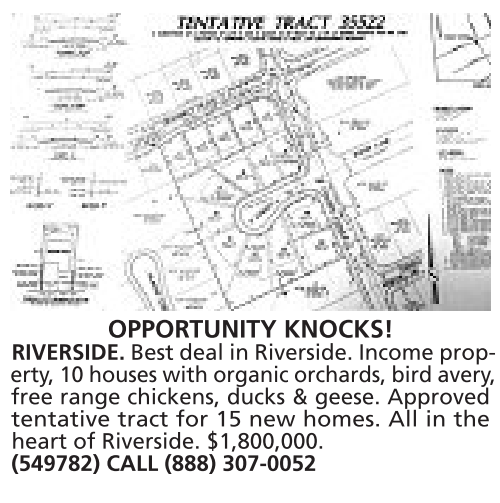 tentative tract for 15 new homes. All in the heart of Riverside. $1,800,000. (549782) CALL (888) 307-0052