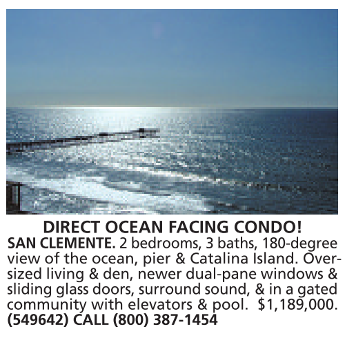 DIRECT OCEAN FACING CONDO! SAN CLEMENTE. 2bedrooms, 3baths, 180-degree view of the ocean, pier & Catalina Island. Oversized living &den, newer dual-pane windows & sliding glass doors, surround sound, &inagated community with elevators & pool. $1,189,000. (549642) CALL (800) 387-1454