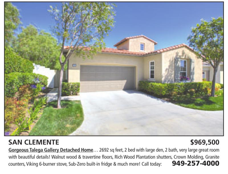 SAN CLEMENTE $969,500 Gorgeous Talega Gallery Detached Home…2692 sq feet, 2bed with large den, 2bath, very large great room with beautiful details! Walnut wood &travertine floors,Rich Wood Plantation shutters,Crown Molding, Granite counters,Viking 6-burner stove,Sub-Zero built-in fridge &much more! Call today: 949-257-4000