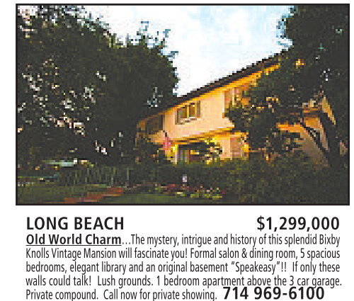LONG BEACH $1,299,000 OldWorld Charm…The mystery, intrigue andhistory of this splendidBixby Knolls VintageMansion will fascinate you! Formal salon&diningroom, 5spacious bedrooms, elegant library and anoriginal basement “Speakeasy”!! Ifonly these walls could talk! Lush grounds. 1bedroom apartment above the 3car garage.