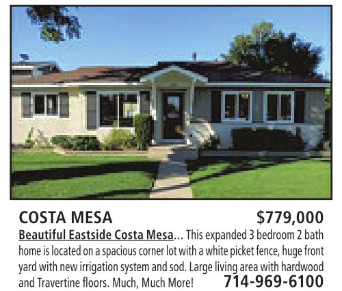 COSTA MESA $779,000 BeautifulEastsideCostaMesa... This expanded3bedroom2bath home is locatedonaspacious corner lotwithawhite picket fence,hugefront yard with new irrigation system andsod. Large living area with hardwood andTravertinefloors.Much,Much More! 714-969-6100