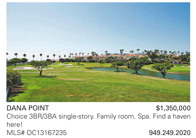 DANA POINT $1,350,000 Choice 3BR/3BA single-story. Family room. Spa. Find a haven here! MLS# OC13167235 949.249.2020