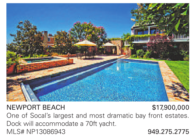 NEWPORT BEACH $17,900,000 One of Socal’s largest and most dramatic bay front estates. Dock will accommodate a 70ft yacht. MLS# NP13086943 949.275.2775