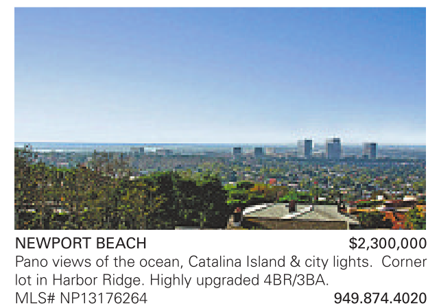NEWPORT BEACH $2,300,000 Pano views of the ocean, Catalina Island & city lights. Corner lot in Harbor Ridge. Highly upgraded 4BR/3BA. MLS# NP13176264 949.874.4020