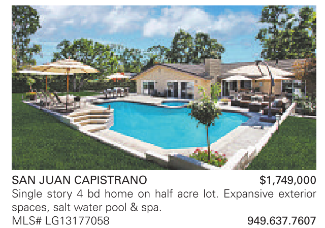 SAN JUAN CAPISTRANO $1,749,000 Single story 4 bd home on half acre lot. Expansive exterior spaces, salt water pool & spa. MLS# LG13177058 949.637.7607