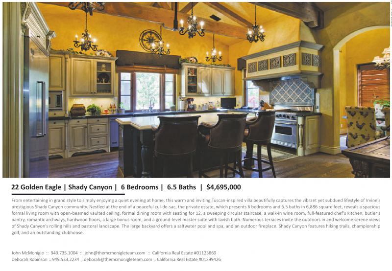 22 Golden Eagle | Shady Canyon | 6 Bedrooms | 6.5 Baths | $4,695,000 From entertaining in grand style to simply enjoying a quiet evening at home, this warm and inviting Tuscan-inspired villa beautifully captures the vibrant yet subdued lifestyle of Irvine’s prestigious Shady Canyon community. Nestled at the end of a peaceful cul-de-sac, the private estate, which presents 6 bedrooms and 6.5 baths in 6,886 square feet, reveals a spacious formal living room with open-beamed vaulted ceiling, formal dining room with seating for 12, a sweeping circular staircase, a walk-in wine room, full-featured chef’s kitchen, butler’s pantry, romantic archways, hardwood floors, a large bonus room, and a ground-level master suite with lavish bath. Numerous terraces invite the outdoors in and welcome serene views of Shady Canyon’s rolling hills and pastoral landscape. The large backyard offers a saltwater pool and spa, and an outdoor fireplace. Shady Canyon features hiking trails, championship golf, and an outstanding clubhouse. John McMonigle :: 949.735.1004 :: john@themcmonigleteam.com :: California Real Estate #01123869 Deborah Robinson :: 949.533.2234 :: deborah@themcmonigleteam.com :: California Real Estate #01399426