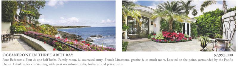 OCEANFRONT IN THREE ARCH BAY $7,995,000 Four Bedrooms, Four & one half baths. Family room, & courtyard entry. French Limestone, granite & so much more. Located on the point, surrounded by the Pacific Ocean. Fabulous for entertaining with great oceanfront decks, barbecue and private area.