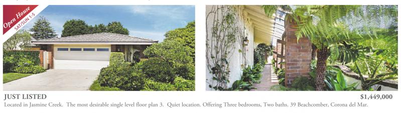 JUST LISTED $1,449,000 Located in Jasmine Creek. The most desirable single level floor plan 3. Quiet location. Offering Three bedrooms, Two baths. 39 Beachcomber, Corona del Mar.