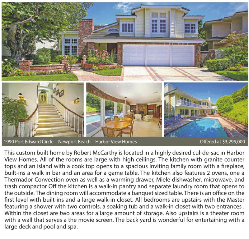 1990 Port EdwardCircle –NewportBeach –Harbor View Homes Offered at $3,295,000 This custom built home by Robert McCarthy is located in a highly desired cul-de-sac in Harbor View Homes. All of the rooms are large with high ceilings. The kitchen with granite counter tops and an island with a cook top opens to a spacious inviting family room with a fireplace, built-ins a walk in bar and an area for a game table. The kitchen also features 2 ovens, one a Thermador Convection oven as well as a warming drawer, Miele dishwasher, microwave, and trash compactor Off the kitchen is a walk-in pantry and separate laundry room that opens to the outside.The dining room will accommodate a banquet sized table.There is an office on the first level with built-ins and a large walk-in closet. All bedrooms are upstairs with the Master featuring a shower with two controls, a soaking tub and a walk-in closet with two entrances . Within the closet are two areas for a large amount of storage. Also upstairs is a theater room with a wall that serves a the movie screen. The back yard is wonderful for entertaining with a large deck and pool and spa.
