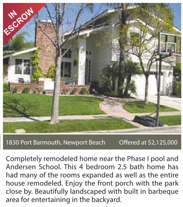 1830 Port Barmouth, NewportBeach Offered at $2,125,000 Completely remodeled home near the Phase I pool and Andersen School. This 4 bedroom 2.5 bath home has had many of the rooms expanded as well as the entire house remodeled. Enjoy the front porch with the park close by. Beautifully landscaped with built in barbeque area for entertaining in the backyard.