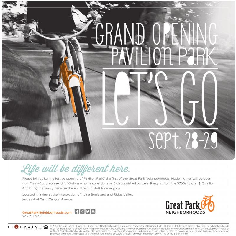 Life will be different here. Please join us for the festive opening of Pavilion Park M the first of the Great Park Neighborhoods. Model homes will be open from 11am–6pm, representing 10 all-new home collections by 8 distinguished builders. Ranging from the $700s to over $1.5 million. And bring the family because there will be fun stuff for everyone. Located in Irvine at the intersection of Irvine Boulevard and Ridge Valley, just east of Sand Canyon Avenue. GreatParkNeighborhoods.com 949.273.2734 ©2013 Heritage Fields El Toro, LLC. Great Park Neighborhoods is aregistered trademark of Heritage Fields El Toro, LLC (Heritage Fields) dba Great Park Neighborhoods used forthe marketing of newhome neighborhoods in Irvine,California. FivePoint Communities Management, Inc. (FivePoint Communities) is the development manager of Great Park Neighborhoods. Neither Heritage Fields nor Five Point Communities is designing, constructing or offering homes for sale in Great Park Neighborhoods. All proposed amenities are subject to change without notice. Lifestyle photography does not reflect any ethnic or racial preference.