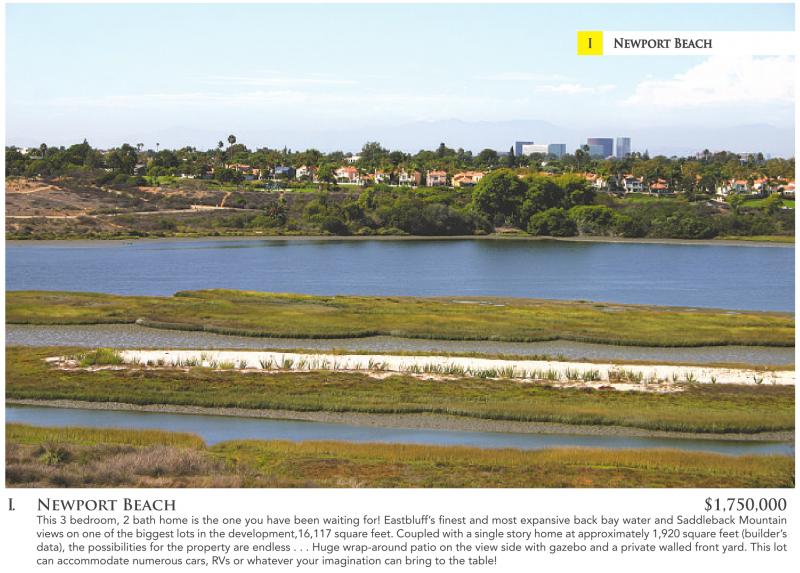 I Newport Beach I. Newport Beach $1,750,000 This 3 bedroom, 2 bath home is the one you have been waiting for! Eastbluff’s finest and most expansive back bay water and Saddleback Mountain views on one of the biggest lots in the development,16,117 square feet. Coupled with a single story home at approximately 1,920 square feet (builder’s data), the possibilities for the property are endless . . . Huge wrap-around patio on the view side with gazebo and a private walled front yard. This lot can accommodate numerous cars, RVs or whatever your imagination can bring to the table!