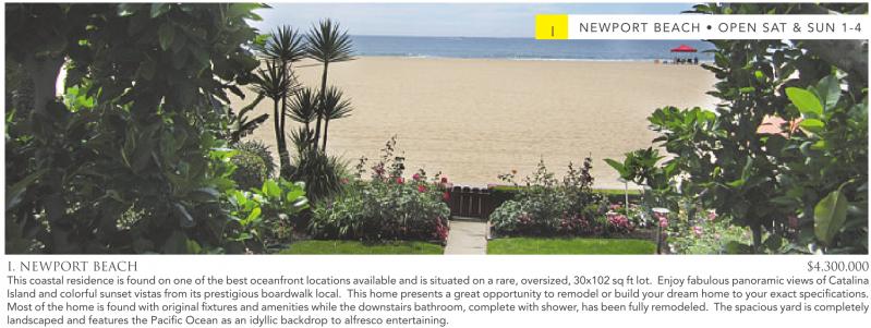 I NEWPORT BEACH • OPEN SAT & SUN 1-4 I. NEWPORT BEACH $4,300,000 This coastal residence is found on one of the best oceanfront locations available and is situated on a rare, oversized, 30x102 sq ft lot. Enjoy fabulous panoramic views of Catalina Island and colorful sunset vistas from its prestigious boardwalk local. This home presents a great opportunity to remodel or build your dream home to your exact specifications. Most of the home is found with original fixtures and amenities while the downstairs bathroom, complete with shower, has been fully remodeled. The spacious yard is completely landscaped and features the Pacific Ocean as an idyllic backdrop to alfresco entertaining.