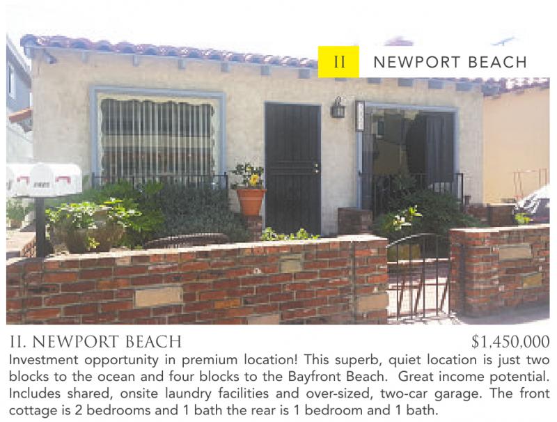 II NEWPORT BEACH II. NEWPORT BEACH $1,450,000 Investment opportunity in premium location! This superb, quiet location is just two blocks to the ocean and four blocks to the Bayfront Beach. Great income potential. Includes shared, onsite laundry facilities and over-sized, two-car garage. The front cottage is 2 bedrooms and 1 bath the rear is 1 bedroom and 1 bath. See also