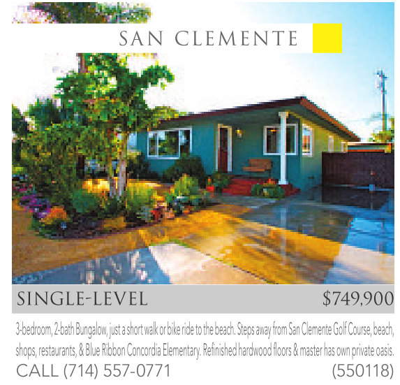 SAN CLEMENTE SINGLE-LEVEL $749,900 3-bedroom,2-bathBungalow,justashortwalk or bikeridetothe beach. StepsawayfromSan Clemente GolfCourse,beach, shops, restaurants,&BlueRibbon ConcordiaElementary.Refinished hardwood floors&masterhas ownprivateoasis. CALL (714) 557-0771 (550118) See also