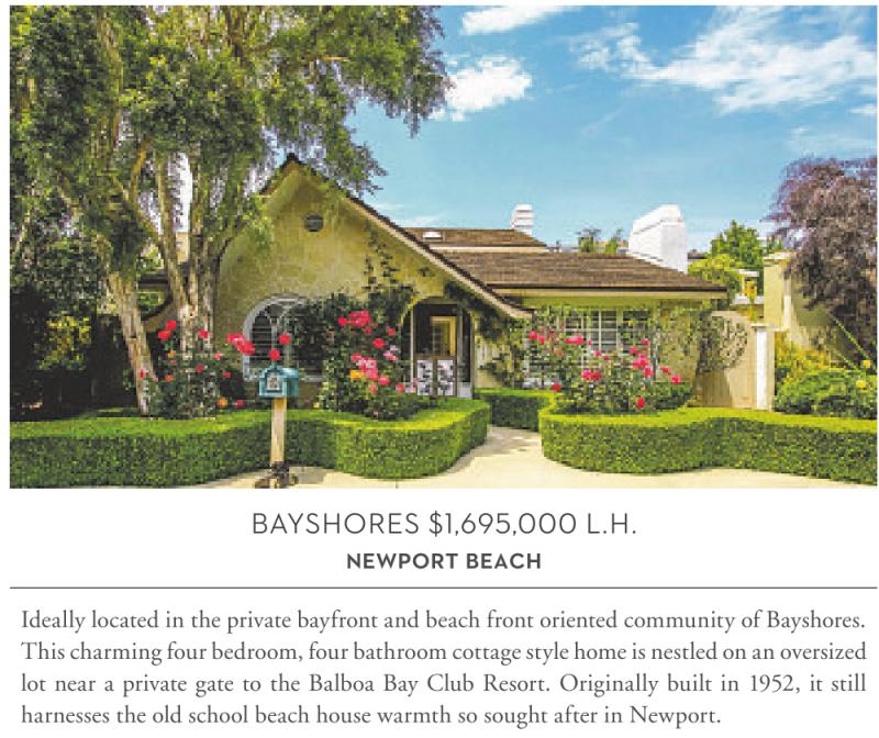 BAYSHORES $1,695,000 L.H. NEWPORT BEACH Ideally located in the private bayfront and beach front oriented community of Bayshores. This charming four bedroom, four bathroom cottagestyle home is nestledonanoversized lot near a private gate to the Balboa Bay Club Resort. Originally built in 1952, it still harnesses the old school beach house warmth so sought after in Newport.