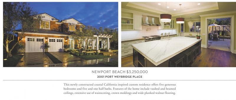 NEWPORT BEACH $3,250,000 2001 PORT WEYBRIDGE PLACE This newly constructed coastal California inspired custom residence offers five generous bedrooms and five and one half baths. Features of the home include vaulted and beamed ceilings, extensive use of wainscoting, crown moldings and wide planked walnut flooring.